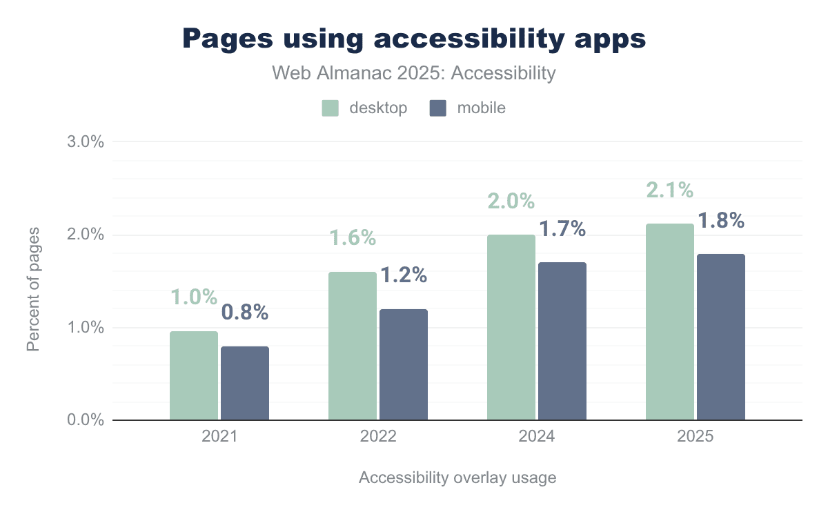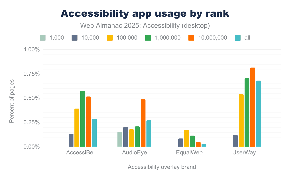 The continued rise of accessibility overlays (now on 2% of sites) is concerning. It seems that organizations often choose shortcuts over genuine accessibility. The IAAP and European Disability Forum have explicitly warned that overlays can interfere with users’ assistive technology and must never replace accessible design. The 2025 data confirms overlays remain concentrated in lower-traffic sites, a sign that high-quality, well-resourced organizations are moving away from them toward real solutions.