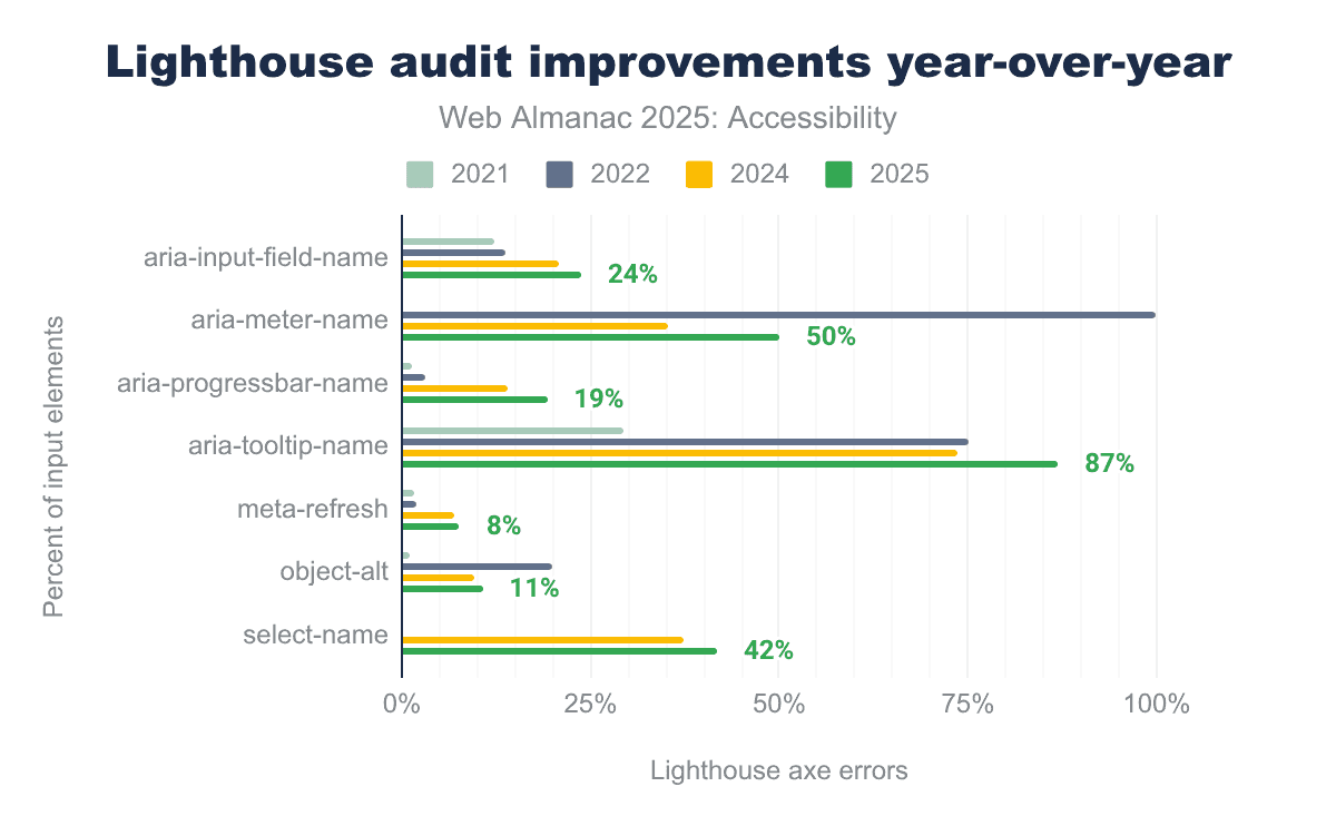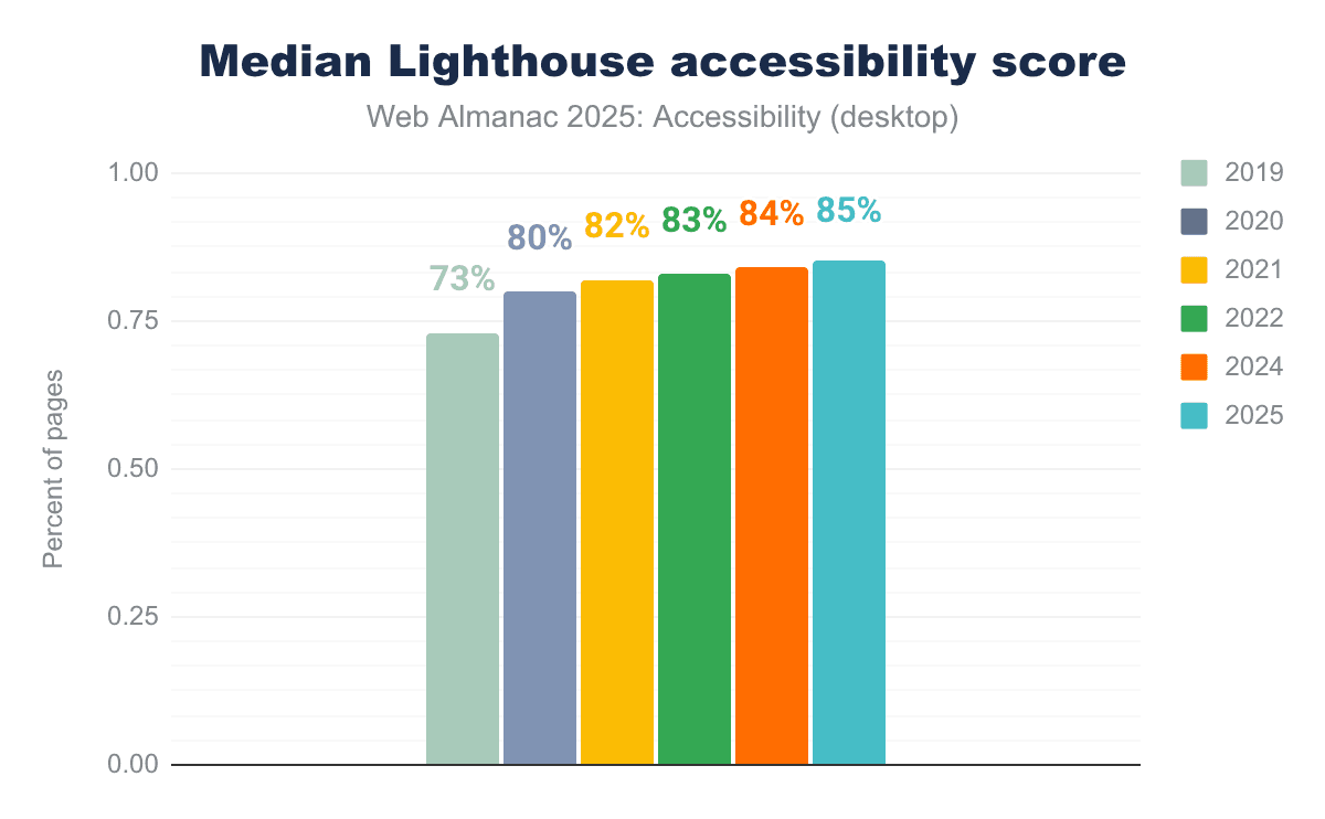 Compared to 2024, the median Lighthouse Accessibility score improved by 1%, reaching over 85% in 2025. Since the first Web Almanac in 2019, we’ve seen steady and incremental progress. Google Lighthouse assigns different weights to axe-core issues, so organizations may prioritize fixes differently.