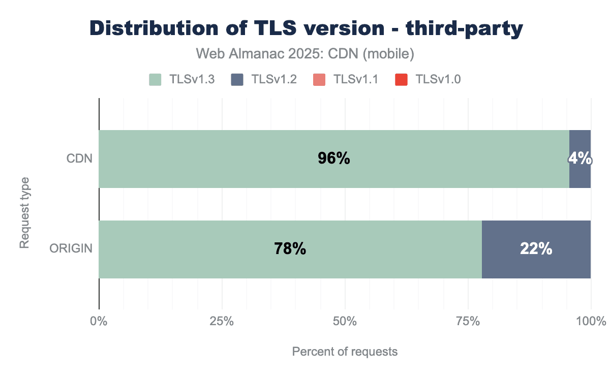 Third-party content shows a similar pattern, with 96% of CDN requests using TLS 1.3 compared to 78% for origin servers. CDN adoption increased modestly from 93% in 2024 to 96% in 2025, while origin servers saw a larger jump from 68% to 78% over the same period.
