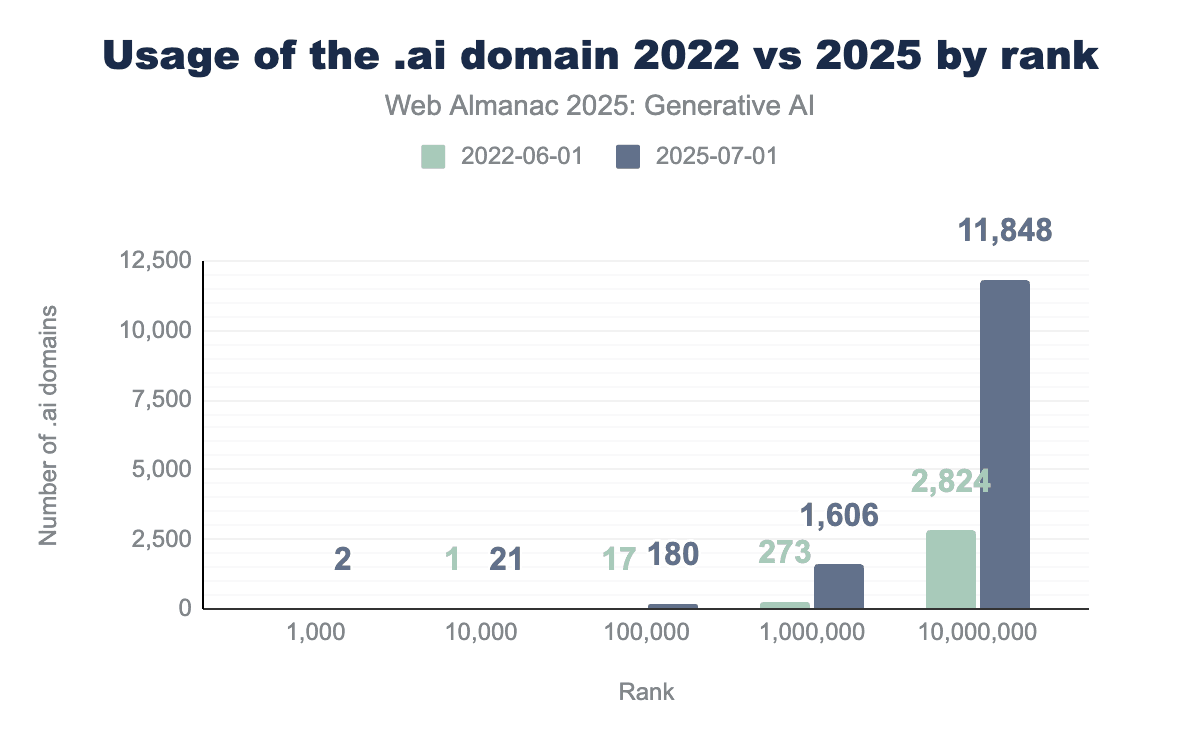 While both AI and the .ai domain existed long before ChatGPT, the new possibilities that emerged in its wake led to a wave of AI-native businesses. Many of them adopted the .ai top-level domain, the country code for Anguilla. This trend drove a substantial rise in .ai domain registrations across all ranks, as shown in the figure above, which compares the pre-ChatGPT landscape in 2022 with usage in 2025.