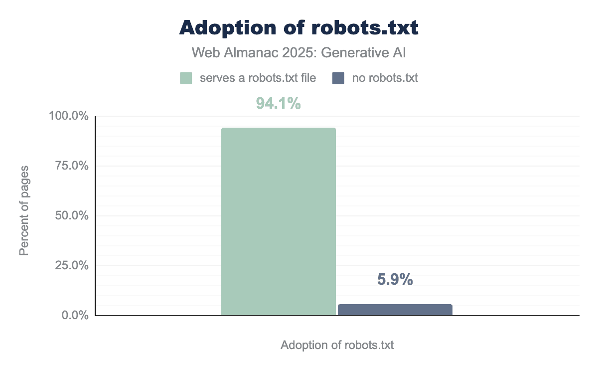 robots.txt. A significant 94.1% of sites serve the file.robots.txt adoption.