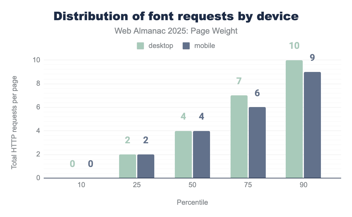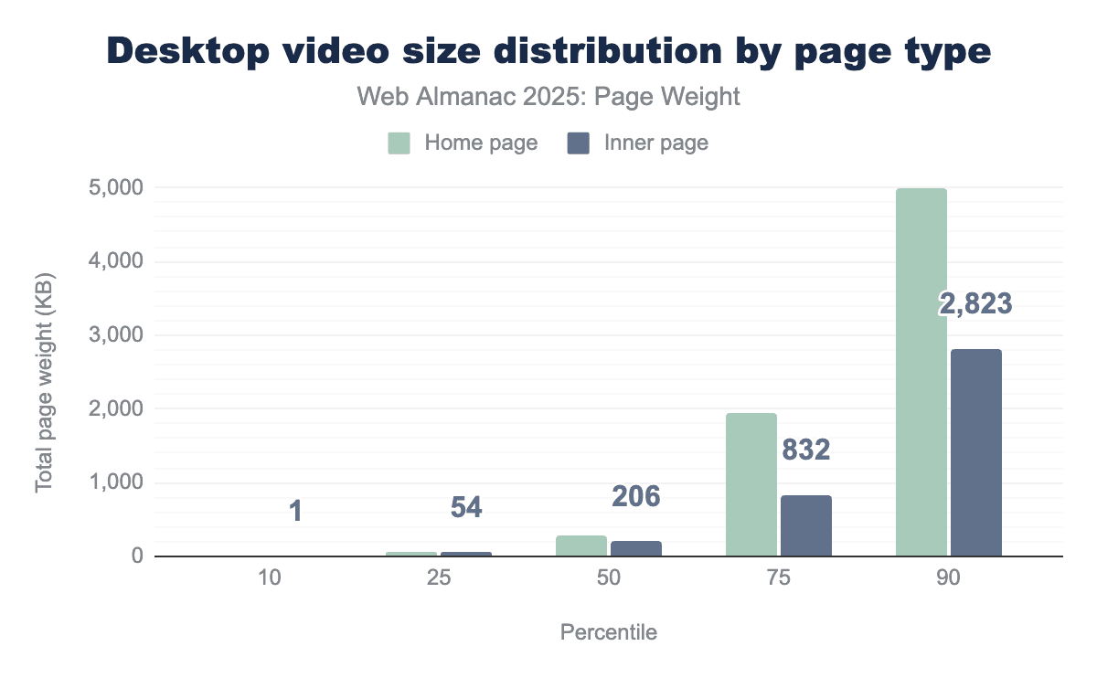 Year over year, the median home page size grew 7.8% to 2.7 MB. The median mobile home page is 2.6 MB, growing 8.4% from 2.4 MB in 2024. In 2025, the median desktop page size reached 2.9 MB, up 7.3% from 2024’s median of 2.7 MB.