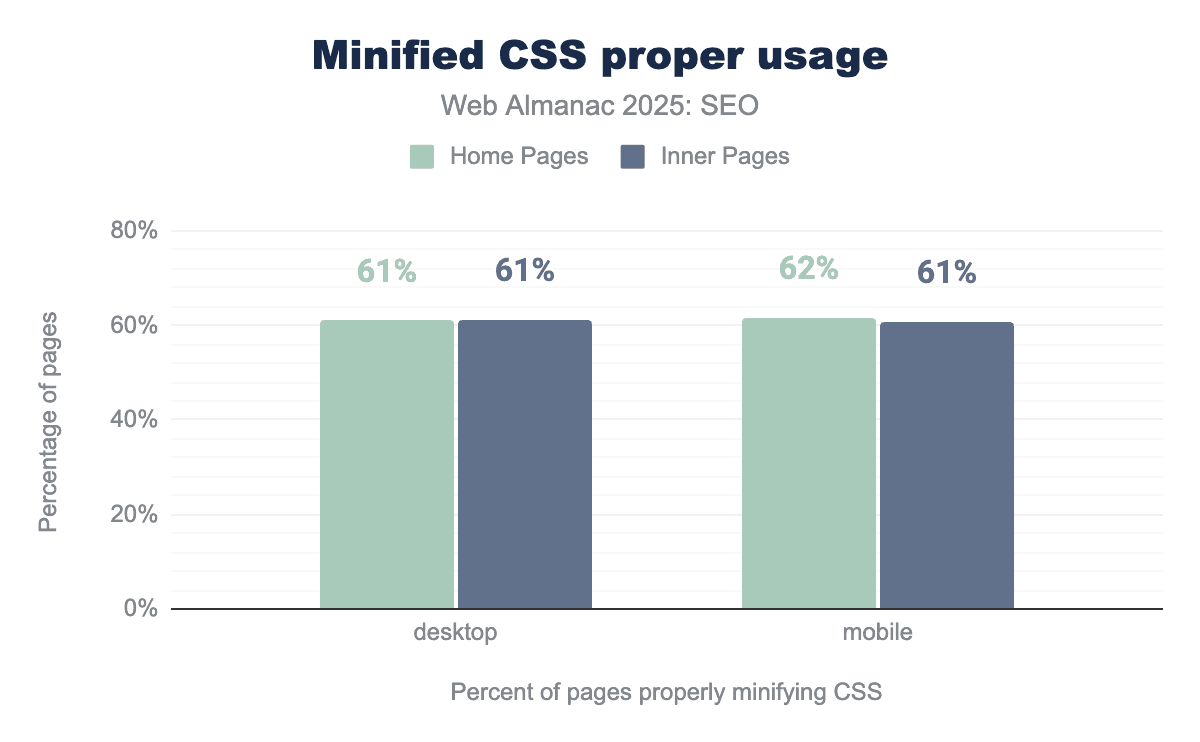 2025’s analysis shows that 61% of desktop, 62% of mobile home page loads, and 61% of desktop and mobile inner page loads passed lighthouse’s Minify CSS audit.