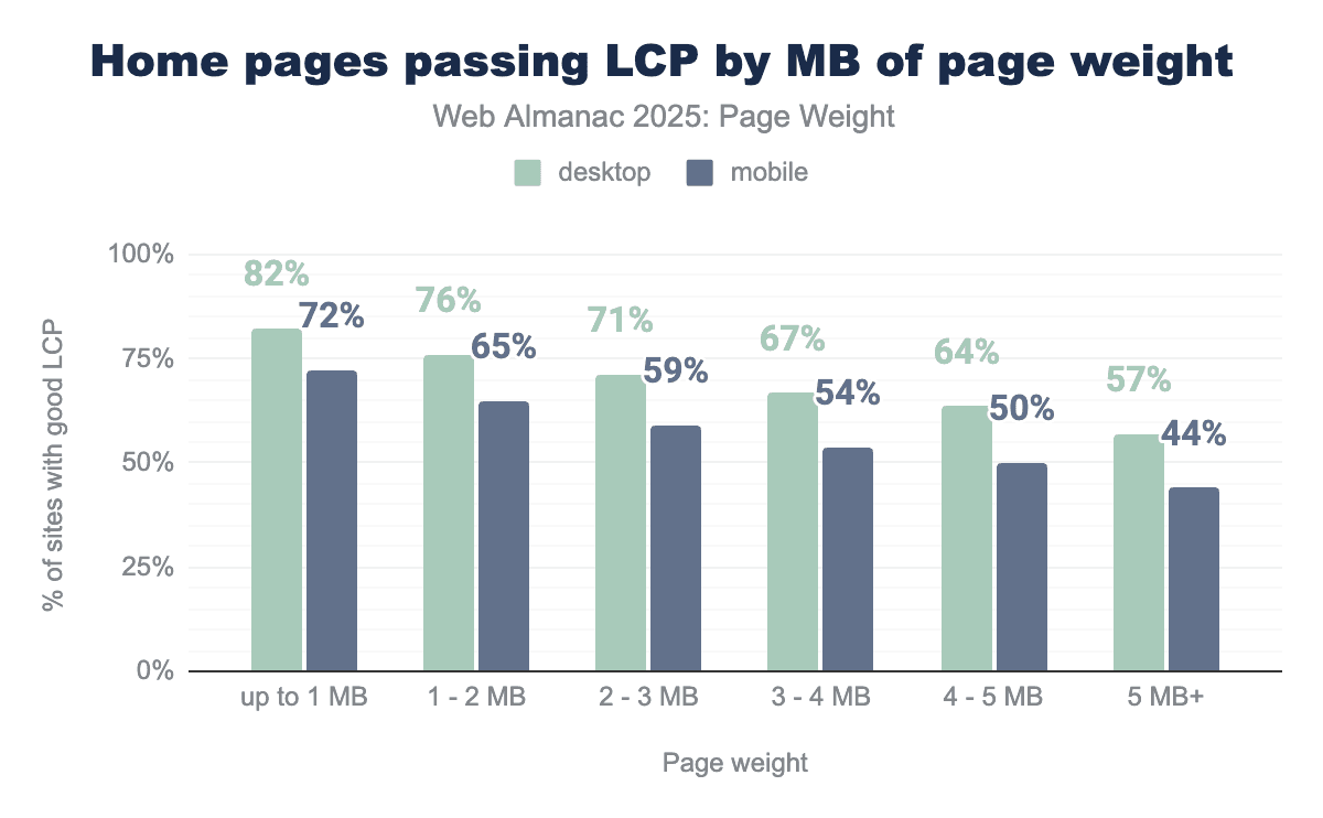 The lightest pages passed LCP, with 82% of desktop and 72% of mobile pages achieving a passing score. Pages in the 2-3 MB range, which represents the median page weight, passed at rates of 71% for desktop and 59% for mobile. The heaviest of pages, ie, those 5 MB or larger, passed rates dropped to 57% for desktop and 44% for mobile.