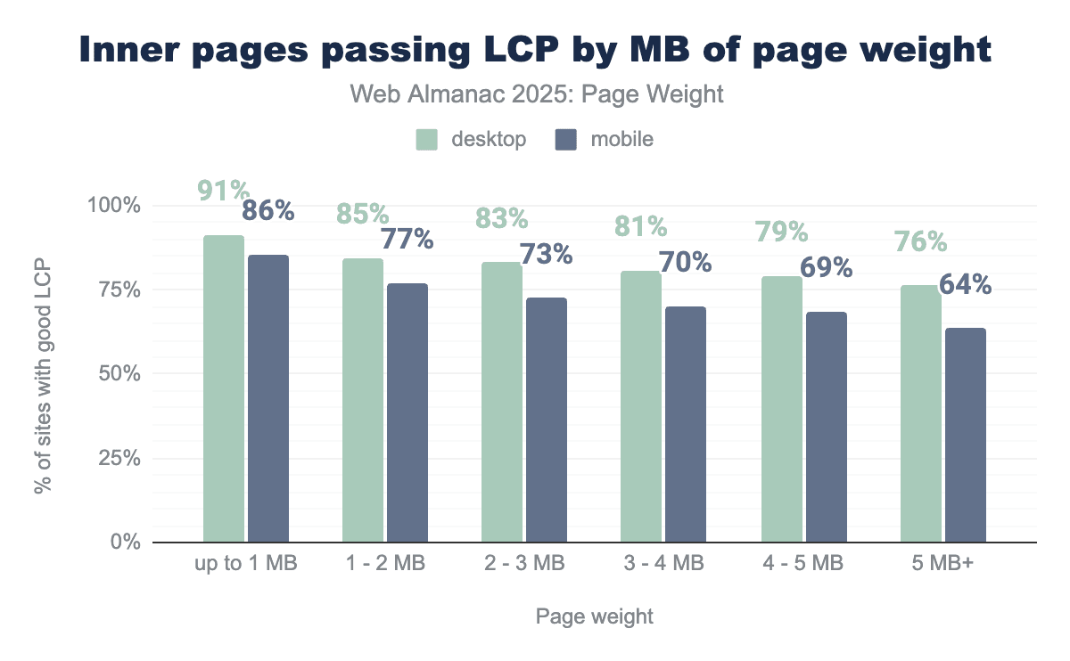 Inner pages show better Largest Contentful Paint performance than home pages. For pages under 1 MB, 91% of desktop and 86% of mobile inner pages passed the metric.