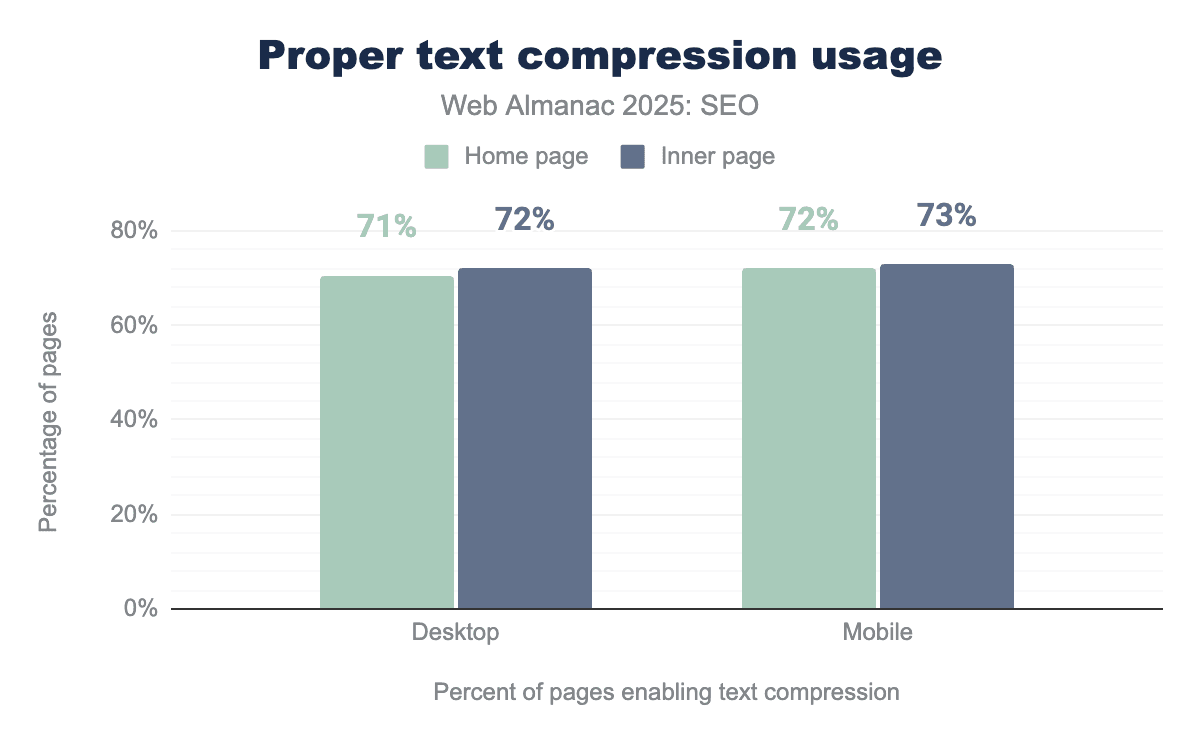 In 2025, 71% of desktop and 72% of mobile home page loads had proper text compression, as measured by Lighthouse’s Enable text compression audit.