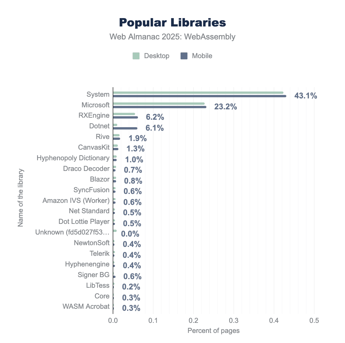 We see that 0.35% of desktop sites and 0.28% of mobile sites are using WebAssembly. This is approximately 43,000 sites in our dataset for both, but with a larger dataset for mobile the relative percentage is lower.