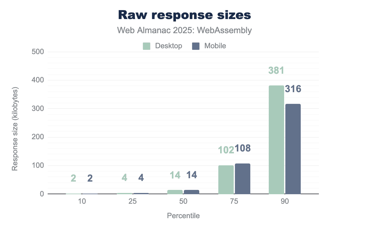 Interestingly, looking over previous Web Almanac years, WebAssembly requests have increased drastically from ~0.05% in 2021 to 0.28%/0.35% this year. There was also a slight dip from 2024.