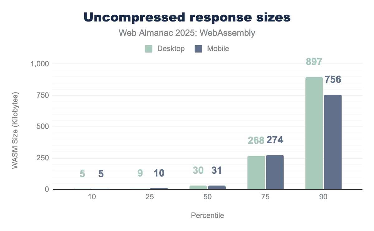 We observed that the MIME type application/wasm is used in 293,470 requests on desktop clients and 301,127 requests on mobile clients.